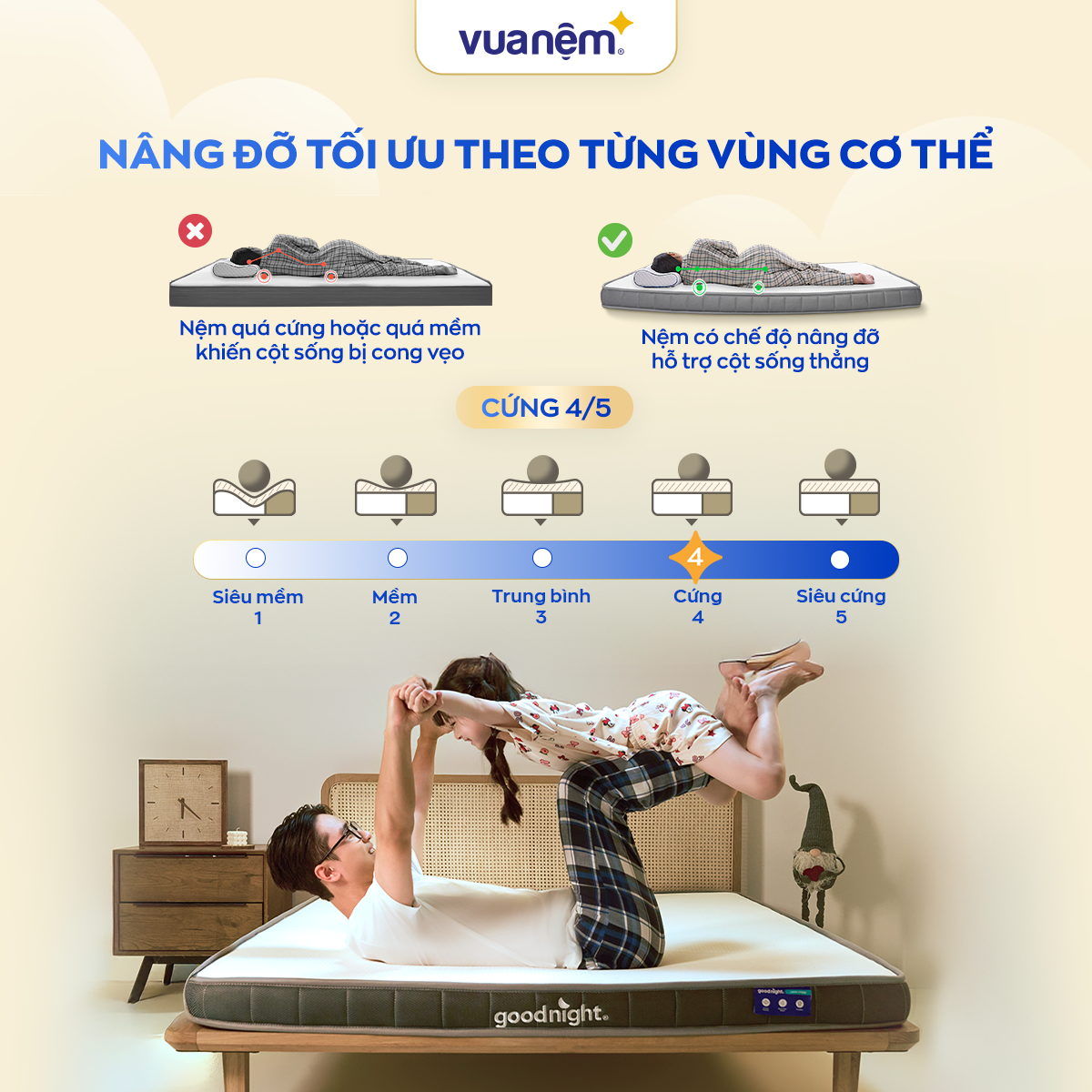 Goodnight là thương hiệu nệm và phụ kiện giấc ngủ được tạo ra dành riêng cho người Việt Nam – từ vóc dáng, thói quen ngủ đến khí hậu nóng ẩm đặc trưng. Mỗi sản phẩm của Goodnight được nghiên cứu tỉ mỉ để mang lại cảm giác nằm êm ái, nâng đỡ đúng chuẩn và bền bỉ với thời gian. Thiết kế trẻ trung, tinh tế cùng chất liệu an toàn giúp Goodnight nhanh chóng trở thành lựa chọn yêu thích của thế hệ trẻ ưu tiên giá trị thật và trải nghiệm tốt.