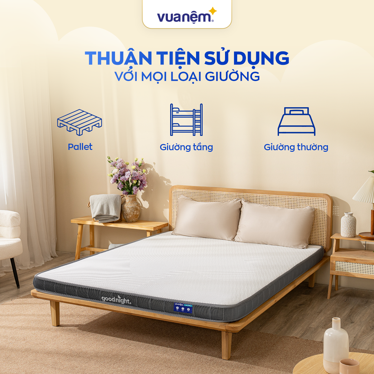 Goodnight tự hào là thương hiệu tiên phong trong lĩnh vực home bedding tại Việt Nam, đồng hành cùng thế hệ trẻ trong hành trình nâng tầm chất lượng sống, biến phòng ngủ thành nơi thể hiện cá tính riêng. Không chỉ có nệm, Goodnight còn mang đến trọn bộ chăn, ga, gối và phụ kiện, đảm bảo sự đồng nhất từ chất lượng đến thẩm mỹ – giúp bạn hoàn thiện không gian sống theo cách của riêng mình.